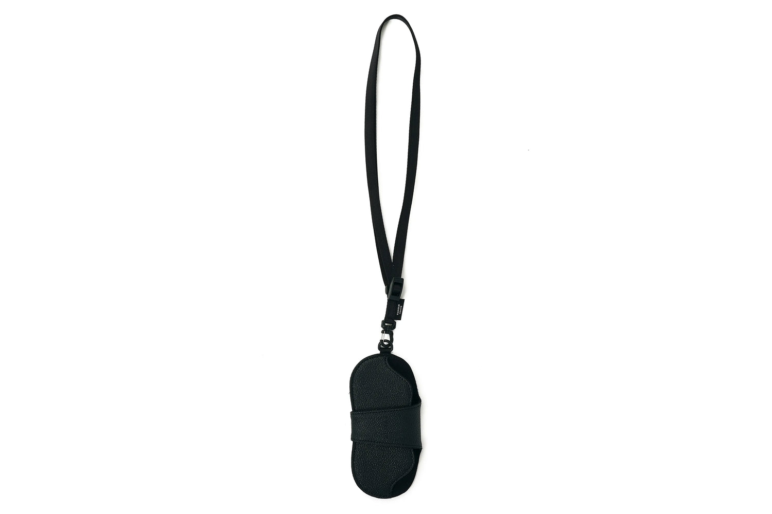 It features a smooth snap closure and detachable strap, with a compact, all-black minimalist design that can be worn like an accessory.