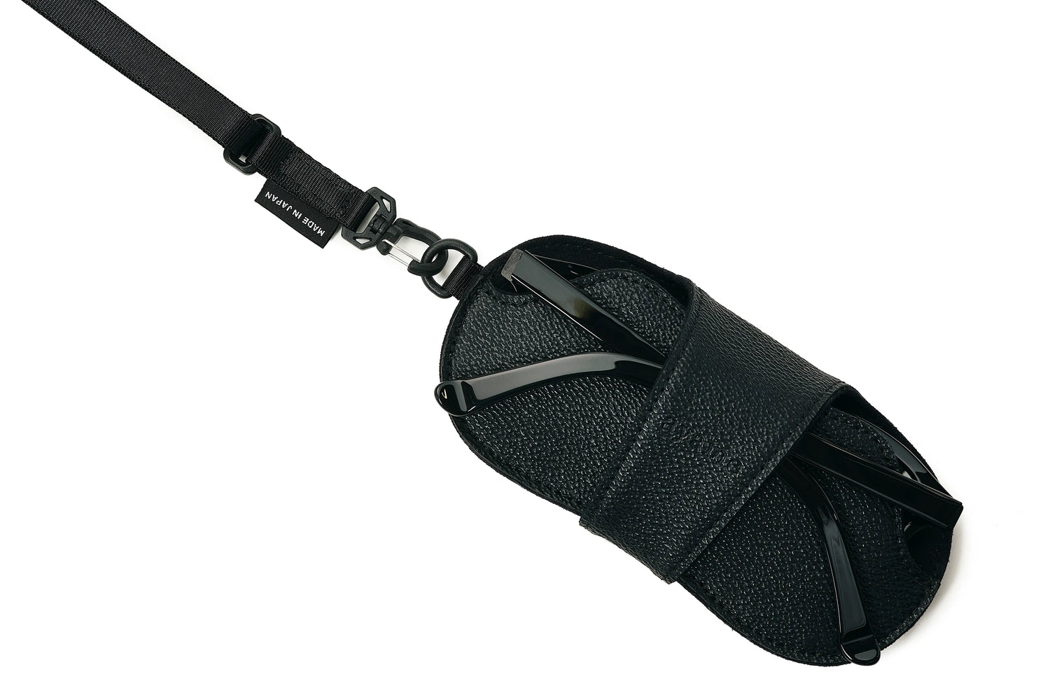 A strap-equipped glasses case with a structure that stores the lenses inward and temples outward. The adjustable strap allows for neck, shoulder, or bag attachment, adapting to various lifestyles.